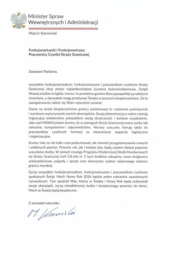 Minister Spraw Wewnętrznych i Administracji pan Marcin Kierwiński przesłał funkcjonariuszom i pracownikom Straży Granicznej życzenia z okazji Świąt Bożego.