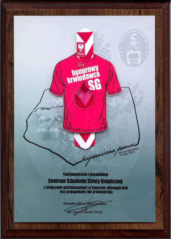 W dniu 16 maja 2014 roku w trakcie centralnych obchodów 23. Rocznicy powołania Straży Granicznej, które w tym roku odbyły się w Krośnie Odrzańskim, Komendant Główny Straży Granicznej gen. dyw. SG Dominik Tracz przekazał na ręce Komendanta Centrum Szkolenia SG Pana płk. SG Sławomira Kowalewskiego podziękowania dla funkcjonariuszy Centrum Szkolenia Straży Granicznej za honorowe oddawanie krwi oraz propagowanie idei krwiodawstwa.