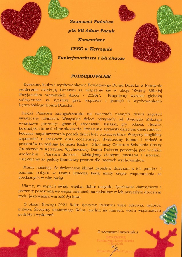 W imieniu dzieci Powiatowego Domu Dziecka w Kętrzynie, podziękowania przekazała Dyrektor Pani Bożena Biegańska-Wójtowicz na ręce płk. SG Adama Pacuka Komendanta Centrum. Za okazane serce, dzieci przygotowały wspaniały plakat i podziękowanie.